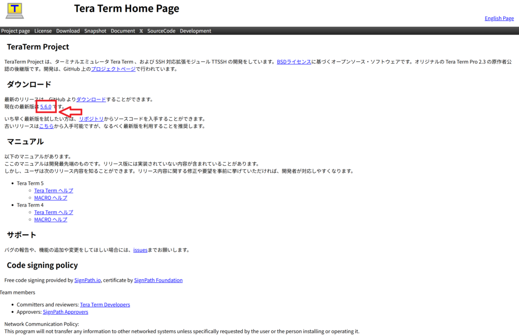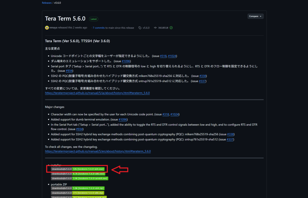 ①TeraTermのHPから最新版のリンクをクリックします。