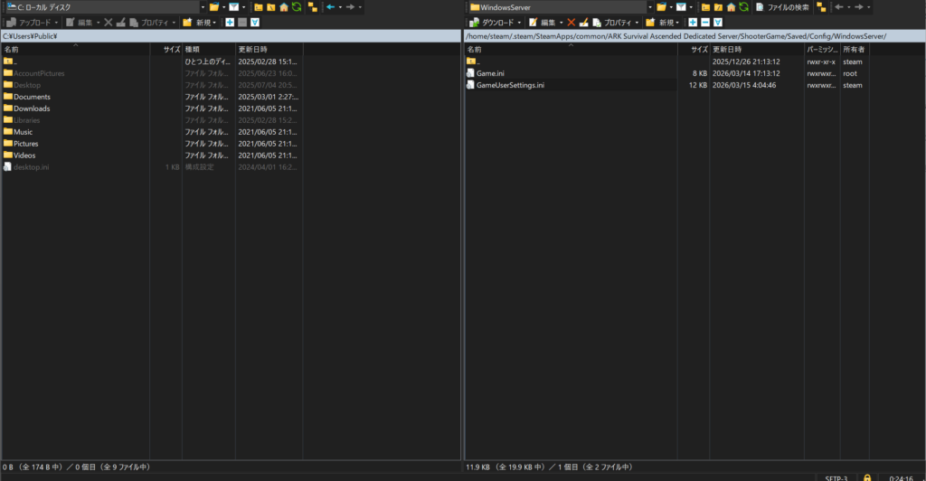 ←左の枠がローカルフォルダ 右の枠がサーバーフォルダ→
