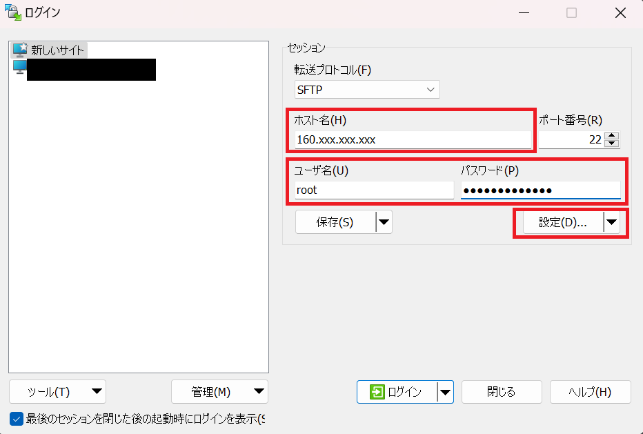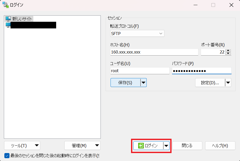 ユーザー名にroot、パスワードにサーバー作成時のパスワードを入力します。