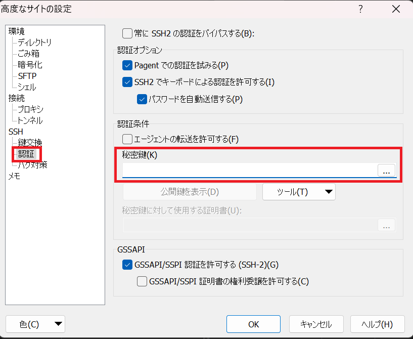 ③SSHの認証の秘密鍵に、ダウンロードしたプライベートキーを指定します。
