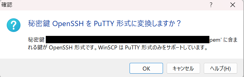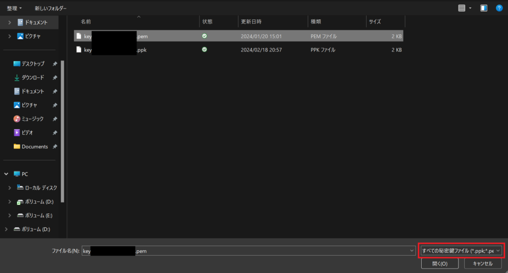 ④ファイル指定の下カテゴリを「すべての秘密鍵ファイル」にしないとSSHキーファイルがでてきません。